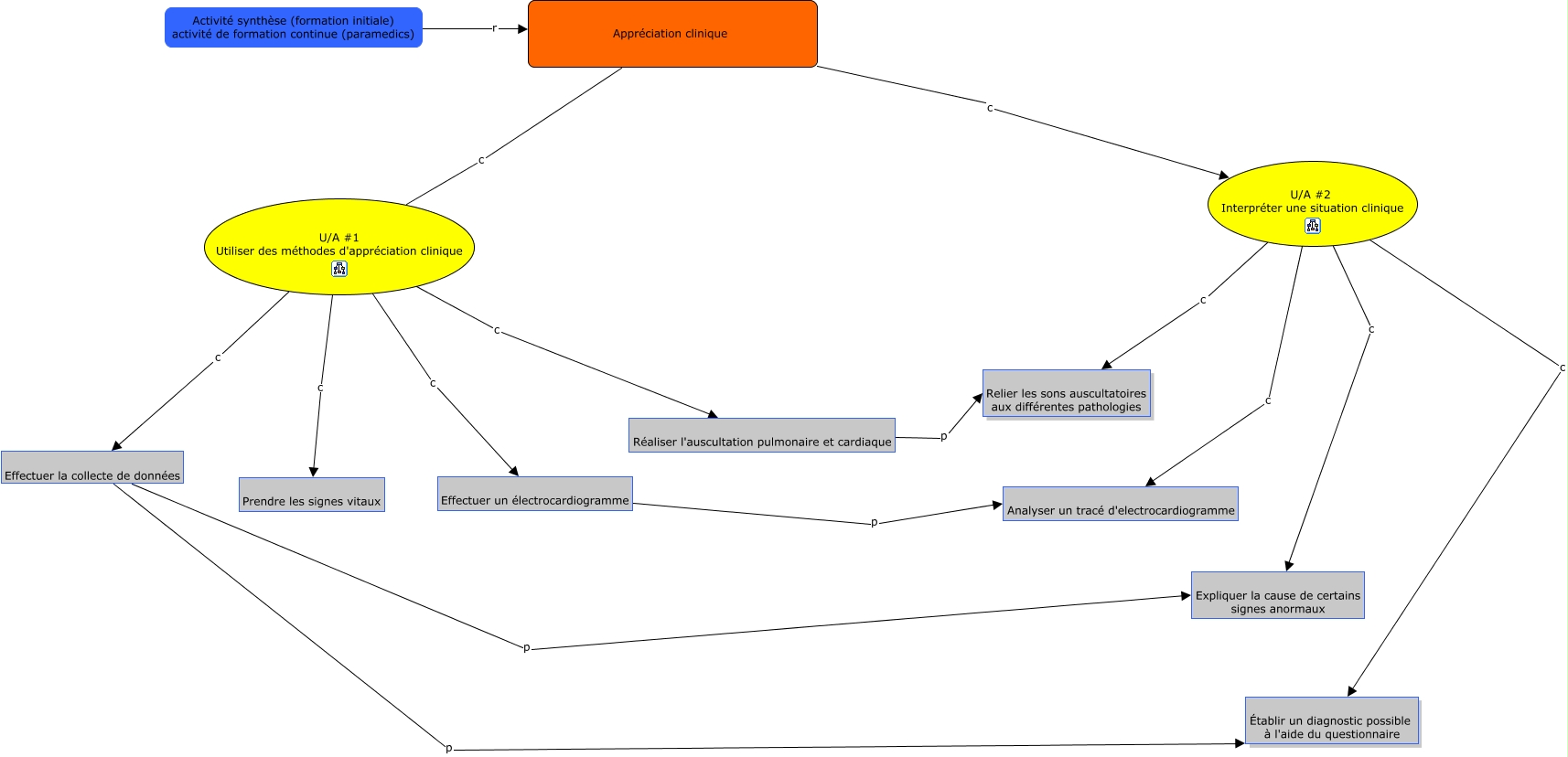 Cette carte de concepts créée avec IHMC CmapTools traite de: SA Laurent Boisclair, U/A #1 Utiliser des méthodes d'appréciation clinique c Réaliser l'auscultation pulmonaire et cardiaque, Effectuer un électrocardiogramme p Analyser un tracé d'electrocardiogramme, U/A #1 Utiliser des méthodes d'appréciation clinique c Prendre les signes vitaux, U/A #2 Interpréter une situation clinique c Relier les sons auscultatoires aux différentes pathologies, U/A #1 Utiliser des méthodes d'appréciation clinique c Effectuer un électrocardiogramme, U/A #2 Interpréter une situation clinique c Analyser un tracé d'electrocardiogramme, Effectuer la collecte de données p Expliquer la cause de certains signes anormaux, Activité synthèse (formation initiale) activité de formation continue (paramedics) r Appréciation clinique, U/A #1 Utiliser des méthodes d'appréciation clinique c Effectuer la collecte de données, Appréciation clinique c U/A #2 Interpréter une situation clinique, U/A #2 Interpréter une situation clinique c Établir un diagnostic possible à l'aide du questionnaire, U/A #2 Interpréter une situation clinique c Expliquer la cause de certains signes anormaux, Réaliser l'auscultation pulmonaire et cardiaque p Relier les sons auscultatoires aux différentes pathologies, Appréciation clinique c U/A #1 Utiliser des méthodes d'appréciation clinique, Effectuer la collecte de données p Établir un diagnostic possible à l'aide du questionnaire