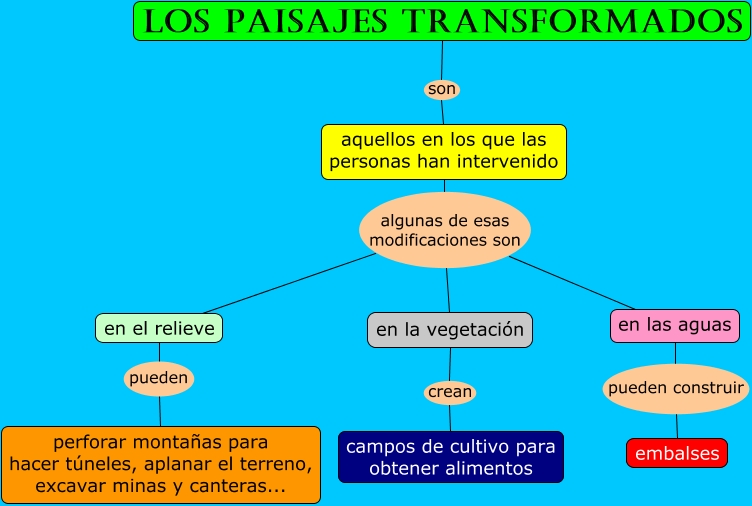 Este Cmap, tiene información relacionada con: Los paisajes transformados, LOS PAISAJES TRANSFORMADOS son aquellos en los que las personas han intervenido, en la vegetación crean campos de cultivo para obtener alimentos, aquellos en los que las personas han intervenido algunas de esas modificaciones son en las aguas, en las aguas pueden construir embalses, aquellos en los que las personas han intervenido algunas de esas modificaciones son en la vegetación, en el relieve pueden perforar montañas para hacer túneles, aplanar el terreno, excavar minas y canteras..., aquellos en los que las personas han intervenido algunas de esas modificaciones son en el relieve