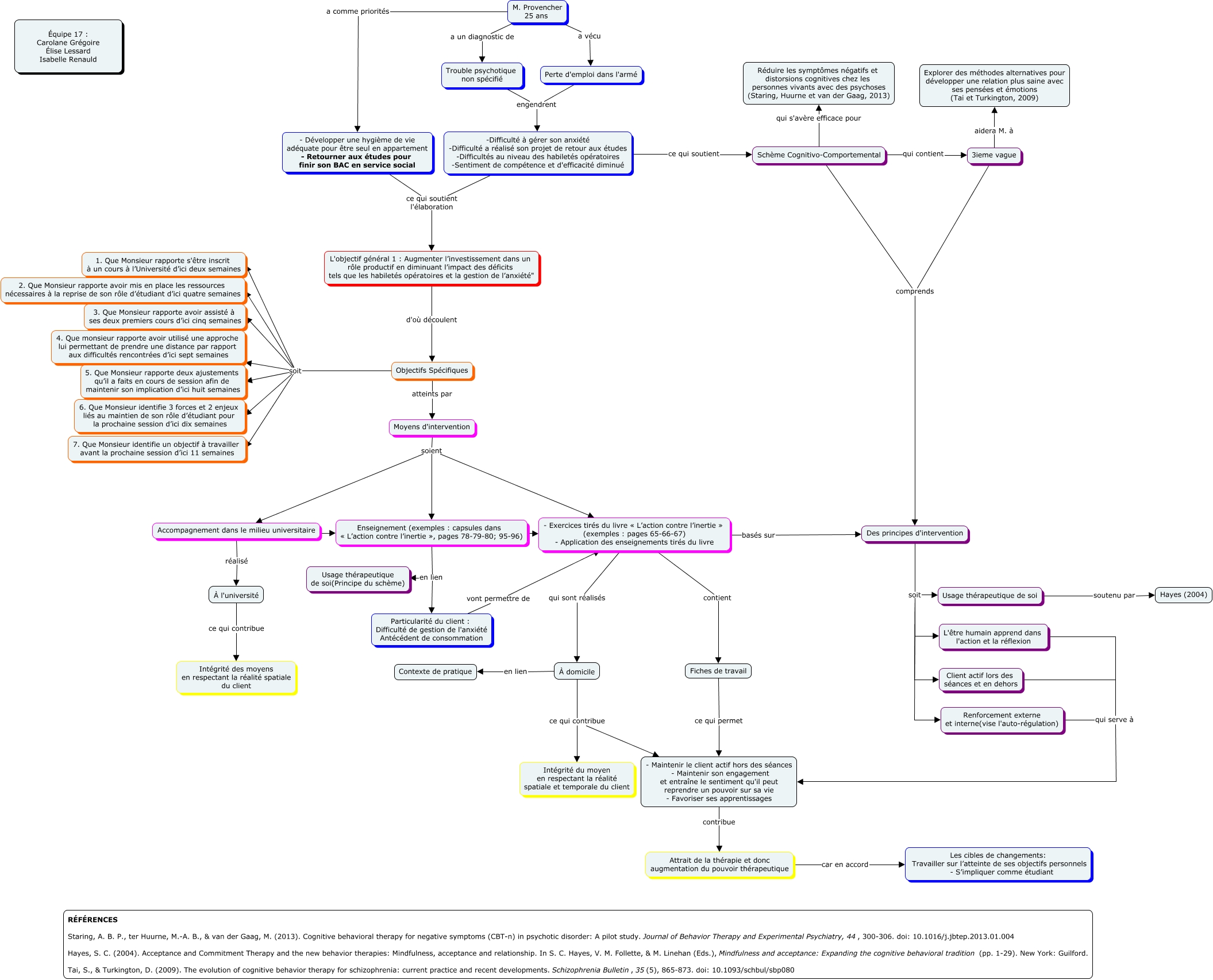 Cette carte de concepts créée avec IHMC CmapTools traite de: M.Provencher, Accompagnement dans le milieu universitaire ???? Enseignement (exemples : capsules dans « L’action contre l’inertie », pages 78-79-80; 95-96), Objectifs Spécifiques soit 4. Que monsieur rapporte avoir utilisé une approche lui permettant de prendre une distance par rapport aux difficultés rencontrées d’ici sept semaines, Objectifs Spécifiques soit 6. Que Monsieur identifie 3 forces et 2 enjeux liés au maintien de son rôle d’étudiant pour la prochaine session d’ici dix semaines, - Exercices tirés du livre « L’action contre l’inertie » (exemples : pages 65-66-67) - Application des enseignements tirés du livre contient Fiches de travail, Des principes d'intervention soit Renforcement externe et interne(vise l'auto-régulation), L'objectif général 1 : Augmenter l’investissement dans un rôle productif en diminuant l’impact des déficits tels que les habiletés opératoires et la gestion de l’anxiété" d'où découlent Objectifs Spécifiques, - Maintenir le client actif hors des séances - Maintenir son engagement et entraîne le sentiment qu'il peut reprendre un pouvoir sur sa vie - Favoriser ses apprentissages contribue Attrait de la thérapie et donc augmentation du pouvoir thérapeutique, M. Provencher 25 ans a comme priorités - Développer une hygième de vie adéquate pour être seul en appartement - Retourner aux études pour finir son BAC en service social, Usage thérapeutique de soi soutenu par Hayes (2004), - Développer une hygième de vie adéquate pour être seul en appartement - Retourner aux études pour finir son BAC en service social ce qui soutient l'élaboration L'objectif général 1 : Augmenter l’investissement dans un rôle productif en diminuant l’impact des déficits tels que les habiletés opératoires et la gestion de l’anxiété", À domicile ce qui contribue - Maintenir le client actif hors des séances - Maintenir son engagement et entraîne le sentiment qu'il peut reprendre un pouvoir sur sa vie - Favoriser ses apprentissages, Enseignement (exemples : capsules dans « L’action contre l’inertie », pages 78-79-80; 95-96) ???? - Exercices tirés du livre « L’action contre l’inertie » (exemples : pages 65-66-67) - Application des enseignements tirés du livre, À l'université ce qui contribue Intégrité des moyens en respectant la réalité spatiale du client, Attrait de la thérapie et donc augmentation du pouvoir thérapeutique car en accord Les cibles de changements: Travailler sur l’atteinte de ses objectifs personnels - S’impliquer comme étudiant, Schème Cognitivo-Comportemental comprends Des principes d'intervention, Objectifs Spécifiques soit 3. Que Monsieur rapporte avoir assisté à ses deux premiers cours d’ici cinq semaines, Objectifs Spécifiques soit 5. Que Monsieur rapporte deux ajustements qu’il a faits en cours de session afin de maintenir son implication d’ici huit semaines, Fiches de travail ce qui permet - Maintenir le client actif hors des séances - Maintenir son engagement et entraîne le sentiment qu'il peut reprendre un pouvoir sur sa vie - Favoriser ses apprentissages, -Difficulté à gérer son anxiété -Difficulté a réalisé son projet de retour aux études -Difficultés au niveau des habiletés opératoires -Sentiment de compétence et d'efficacité diminué ce qui soutient Schème Cognitivo-Comportemental, Particularité du client : Difficulté de gestion de l'anxiété Antécédent de consommation vont permettre de - Exercices tirés du livre « L’action contre l’inertie » (exemples : pages 65-66-67) - Application des enseignements tirés du livre