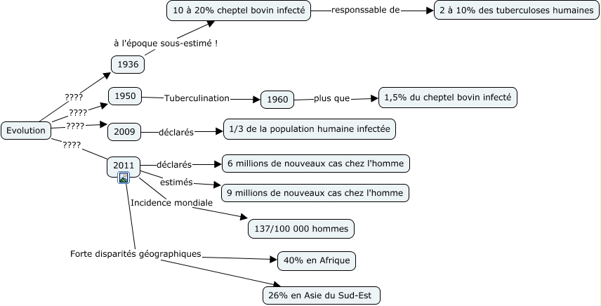 Cette carte de concepts créée avec IHMC CmapTools traite de: Noeud imbriqué - evolution, 2011 déclarés 6 millions de nouveaux cas chez l'homme, Evolution ???? 2009, 2011 Forte disparités géographiques 26% en Asie du Sud-Est, 10 à 20% cheptel bovin infecté responssable de 2 à 10% des tuberculoses humaines, Evolution ???? 1950, 2011 Forte disparités géographiques 40% en Afrique, 1960 plus que 1,5% du cheptel bovin infecté, Evolution ???? 1936, Evolution ???? 2011, 2011 estimés 9 millions de nouveaux cas chez l'homme, 1950 Tuberculination 1960, 2011 Incidence mondiale 137/100 000 hommes, 2009 déclarés 1/3 de la population humaine infectée, 1936 à l'époque sous-estimé ! 10 à 20% cheptel bovin infecté