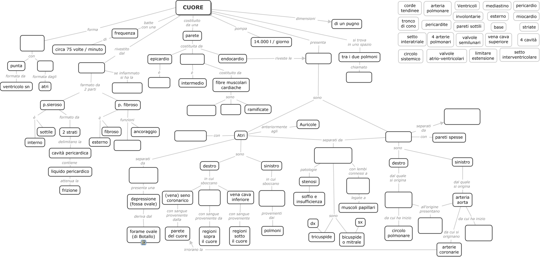 Questa Cmap, creata con IHMC CmapTools, contiene informazioni relative a: Cuore - Mappa da completare, da cui ha inizio circolo polmonare, stenosi soffio e insufficienza, sono sinistro, destro in cui sboccano (vena) seno coronarico, p. fibroso funzioni, arteria aorta da cui ha inizio, con pareti spesse, fibre muscolari cardiache sono ramificate, provenienti dai polmoni, tra i due polmoni chiamato, parete costituita da endocardio, p. fibroso è fibroso, (vena) seno coronarico con sangue proveniente dalla parete del cuore, sono tricuspide, sono bicuspide o mitrale, p.sieroso formato da 2 strati, arteria aorta all'origine presentano, CUORE rivestito dal, 2 strati delimitano la cavità pericardica, destro dal quale si origina