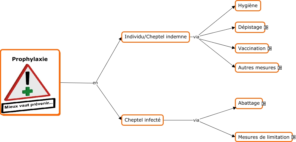 Cette carte de concepts créée avec IHMC CmapTools traite de: Prophylaxie, Prophylaxie en Cheptel infecté, Vaccination par Autres vaccins, Mesures de limitation de l'infection pour les animaux Interdiction de sortie, Autres mesures comme Protection aux frontières, Individu/Cheptel indemne via Hygiène, Individu/Cheptel indemne via Autres mesures, Dépistage des élevages infectés par Enquête épidémiologique, Protection d'un cheptel indemne par Introduction uniquement d'animaux venant de cheptels indemnes, Dépistage des élevages infectés par Intradermotuberculination, Autres mesures comme Protection d'un cheptel indemne, Mesures de limitation de l'infection pour les animaux Maintien à l'écart, Protection d'un cheptel indemne en Evitant les contacts avec un étable infectée, Cheptel infecté via Mesures de limitation, Protection d'un cheptel indemne par Mise en quarantaine de animaux introduits, Individu/Cheptel indemne via Dépistage, Abattage soit Sélectif, Protection d'un cheptel indemne par Contrôle des animaux introduits, Abattage soit Total, Dépistage des élevages infectés par Inspection des carcasses à l'abattoir, Vaccination par BCG