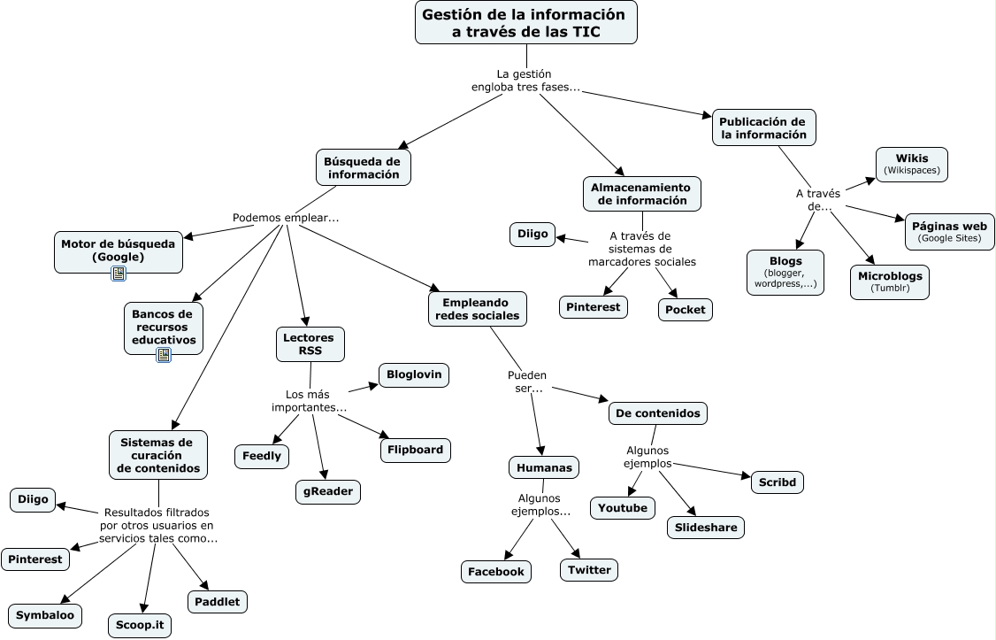 Este Cmap, tiene información relacionada con: gestión de la información, Almacenamiento de información A través de sistemas de marcadores sociales Pocket, Empleando redes sociales Pueden ser... De contenidos, De contenidos Algunos ejemplos Slideshare, Empleando redes sociales Pueden ser... Humanas, Publicación de la información A través de... Microblogs (Tumblr), Búsqueda de información Podemos emplear... Empleando redes sociales, Sistemas de curación de contenidos Resultados filtrados por otros usuarios en servicios tales como... Symbaloo, Lectores RSS Los más importantes... gReader, De contenidos Algunos ejemplos Scribd, Sistemas de curación de contenidos Resultados filtrados por otros usuarios en servicios tales como... Diigo, Lectores RSS Los más importantes... Flipboard, Publicación de la información A través de... Wikis (Wikispaces), Sistemas de curación de contenidos Resultados filtrados por otros usuarios en servicios tales como... Paddlet, Sistemas de curación de contenidos Resultados filtrados por otros usuarios en servicios tales como... Pinterest, Gestión de la información a través de las TIC La gestión engloba tres fases... Almacenamiento de información, De contenidos Algunos ejemplos Youtube, Lectores RSS Los más importantes... Feedly, Búsqueda de información Podemos emplear... Motor de búsqueda (Google), Almacenamiento de información A través de sistemas de marcadores sociales Diigo, Lectores RSS Los más importantes... Bloglovin