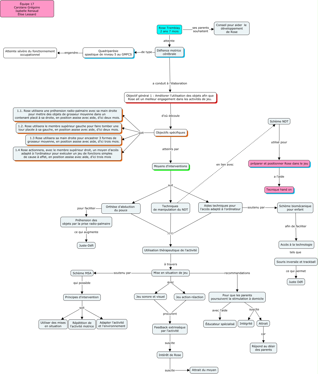 Cette carte de concepts créée avec IHMC CmapTools traite de: Rose Tremblay, Moyens d'interventions soit Techniques de manipulation du NDT, Objectif général 1 : Améliorer l’utilisation des objets afin que Rose ait un meilleur engagement dans les activités de jeu. d'où découle Objectifs spécifiques, Accès à la technologie tels que Souris inversée et trackball, Quadriparésie spastique de niveau 5 au GMFCS engendre Atteinte sévère du fonctionnement occupationnel, Moyens d'interventions soit Aides techniques pour l'accès adapté à l'ordinateur, Techniques de manipulation du NDT en lien avec Schème NDT, Mise en situation de jeu recommandations Pour que les parents poursuivent la stimulation à domicile, Pour que les parents poursuivent la stimulation à domicile avec l'aide Éducateur spécialisé, Schème MSA qui possède Principes d'intervention, Techniques de manipulation du NDT ???? Utilisation thérapeutique de l'activité, Jeu action-réaction procurent Feedback extrinsèque par l'activité, Accès à la technologie tels que Souris inversée et trackball, Mise en situation de jeu soutenu par Schème MSA, Défience motrice cérébrale de type Quadriparésie spastique de niveau 5 au GMFCS, Pour que les parents poursuivent la stimulation à domicile suscite Intégrité, préparer et positionner Rose dans le jeu a l'aide Tecnique hand on, Aides techniques pour l'accès adapté à l'ordinateur soutenu par Schème biomécanique pour enfant, Préhension des objets par la prise radio-palmaire ce qui augmente Juste-Défi, Objectifs spécifiques soit 1.4 Rose actionnera, avec le membre supérieur droit, un moyen d’accès adapté à l’ordinateur pour exécuter un jeu de fonctions simples de cause à effet, en position assise avec aide, d'ici trois mois, Feedback extrinsèque par l'activité suscite Intérêt de Rose