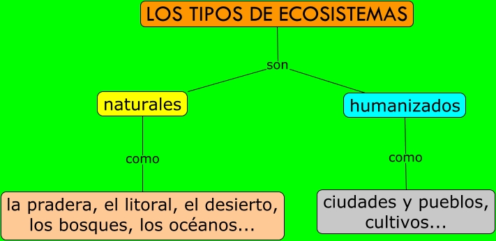 Este Cmap, tiene información relacionada con: Los tipos de ecosistemas, LOS TIPOS DE ECOSISTEMAS son humanizados, humanizados como ciudades y pueblos, cultivos..., LOS TIPOS DE ECOSISTEMAS son naturales, naturales como la pradera, el litoral, el desierto, los bosques, los océanos...