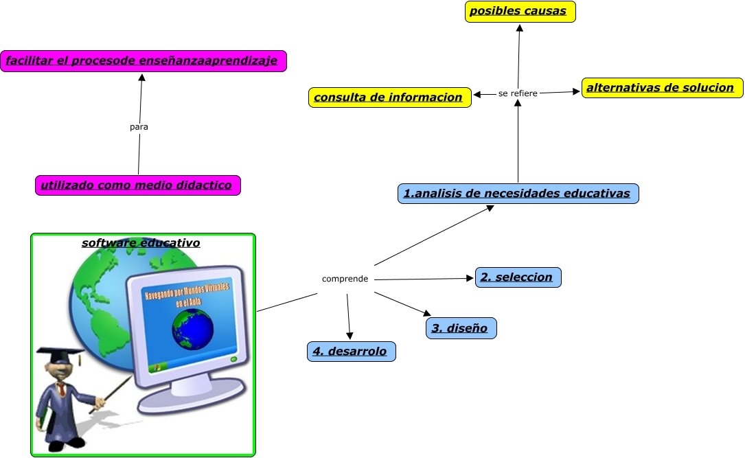 Este Cmap, tiene información relacionada con: NUEVO, software educativo comprende 2. seleccion, utilizado como medio didactico para facilitar el procesode enseñanzaaprendizaje, software educativo comprende 3. diseño, 1.analisis de necesidades educativas se refiere consulta de informacion, 1.analisis de necesidades educativas se refiere alternativas de solucion, 1.analisis de necesidades educativas se refiere posibles causas, software educativo comprende 1.analisis de necesidades educativas, software educativo comprende 4. desarrolo