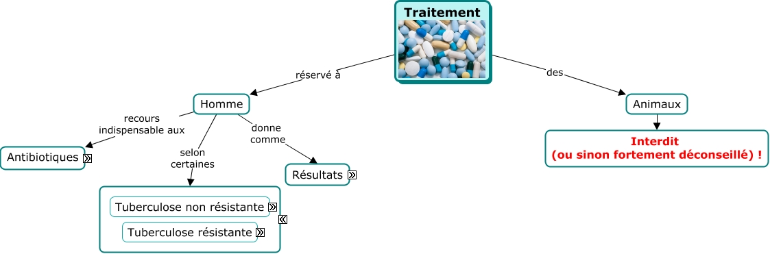 Cette carte de concepts créée avec IHMC CmapTools traite de: Traitement 2, Seconde ligne utilisés en cas de Tuberculose résistante, Phase de bithérapie contient Isoniazide Rifampicine, Traitement des Animaux, Homme selon certaines Modalités thérapeutiques, Phase de quadrithérapie contient Isoniazide Rifampicine Pyrazinamide Ethambutol, Homme donne comme Résultats, Ultra-résistante bacille résistant à Isoniazide et Rifampicine + Fluoroquinolones + Capréomycine, Kanamycine ou Amikacine (aminoglycosides), Multi-résistante bacille résistant à Isoniazide Rifampicine, Traitement réservé à Homme, Animaux Interdit (ou sinon fortement déconseillé) !, Tuberculose non résistante efficacité 95% de guérison, Seconde ligne exemples Kanamycine, amikacine, capréomycine (aminoglycosides) Ethionamide, prothionamide Cycloserine Ofloxacine, levofloxacine (fluoroquinolones) Acide para-aminosalicylique, Dure au moins 6 mois 4 mois Phase de bithérapie, Antibiotiques de Première ligne, Dure au moins 6 mois 2 mois Phase de quadrithérapie, Multi-résistante avec traitement Taux de guérison variable : 6-59%, Antibiotiques de Seconde ligne, Tuberculose non résistante si absence de traitement Mortalité élevée, Homme recours indispensable aux Antibiotiques