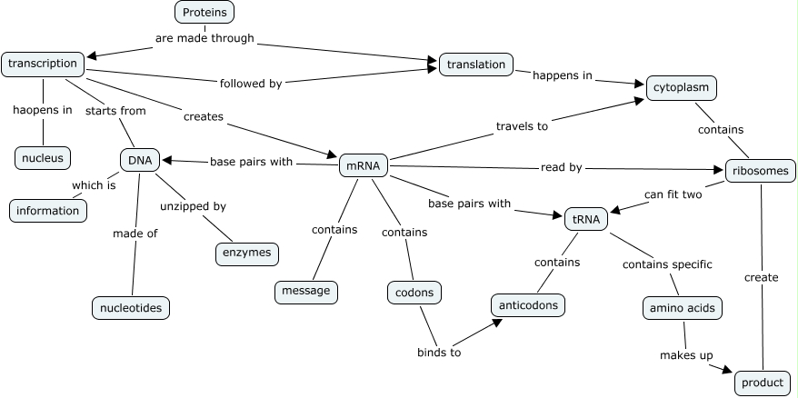 This Concept Map, created with IHMC CmapTools, has information related to: Protein Synthesis, ribosomes create product, Proteins are made through transcription, transcription haopens in nucleus, mRNA base pairs with DNA, mRNA contains message, mRNA travels to cytoplasm, mRNA read by ribosomes, amino acids makes up product, mRNA base pairs with tRNA, ribosomes can fit two tRNA, transcription followed by translation, DNA which is information, Proteins are made through translation, transcription creates mRNA, DNA made of nucleotides, codons binds to anticodons, translation happens in cytoplasm, mRNA contains codons, tRNA contains anticodons, transcription starts from DNA
