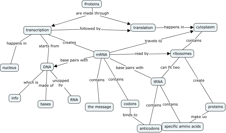 This Concept Map, created with IHMC CmapTools, has information related to: Proteins, cytoplasm contains ribosomes, transcription followed by translation, mRNA read by ribosomes, ribosomes can fit two tRNA, tRNA contains anticodons, codons binds to anticodons, ribosomes create proteins, transcription starts from DNA, Proteins are made through transcription, mRNA base pairs with DNA, mRNA contains codons, mRNA contains the message, mRNA travels to cytoplasm, proteins make uo specific amino acids, Proteins are made through translation, transcription creates mRNA, DNA unzipped by RNA, transcription happens in nucleus, translation happens in cytoplasm, DNA which is info