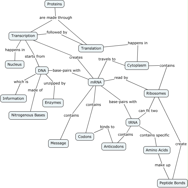 This Concept Map, created with IHMC CmapTools, has information related to: Protein Synthesis, mRNA contains Message, Amino Acids make up Peptide Bonds, Ribosomes create Peptide Bonds, Transcription creates mRNA, Transcription happens in Nucleus, Cytoplasm contains Ribosomes, Transcription followed by Translation, Proteins are made through Transcription, Codons binds to Anticodons, Transcription starts from DNA, DNA made of Nitrogenous Bases, DNA which is Information, mRNA base-pairs with tRNA, mRNA travels to Cytoplasm, mRNA contains Codons, DNA unzipped by Enzymes, DNA base-pairs with mRNA, mRNA read by Ribosomes, Ribosomes can fit two tRNA, tRNA contains Anticodons