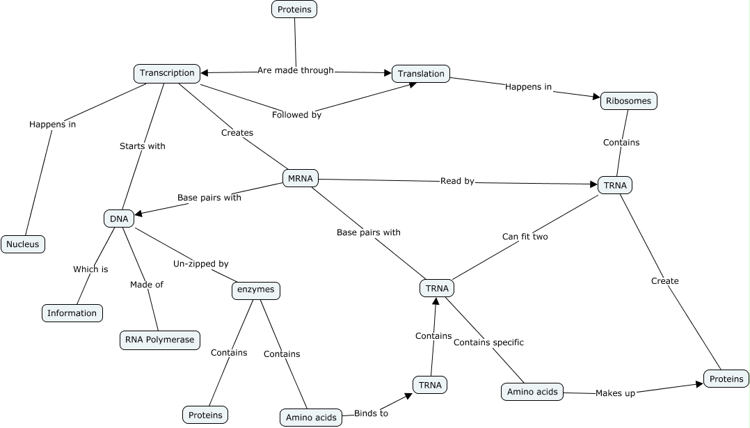 This Concept Map, created with IHMC CmapTools, has information related to: protein synthesis, Transcription Happens in Nucleus, Amino acids Makes up Proteins, enzymes Contains Amino acids, DNA Which is Information, MRNA Read by TRNA, Transcription Followed by Translation, Proteins Are made through Translation, MRNA Base pairs with DNA, enzymes Contains Proteins, MRNA Base pairs with TRNA, TRNA Contains specific Amino acids, Translation Happens in Ribosomes, TRNA Contains TRNA, Proteins Are made through Transcription, TRNA Can fit two TRNA, Amino acids Binds to TRNA, DNA Un-zipped by enzymes, Transcription Creates MRNA, Transcription Starts with DNA, DNA Made of RNA Polymerase