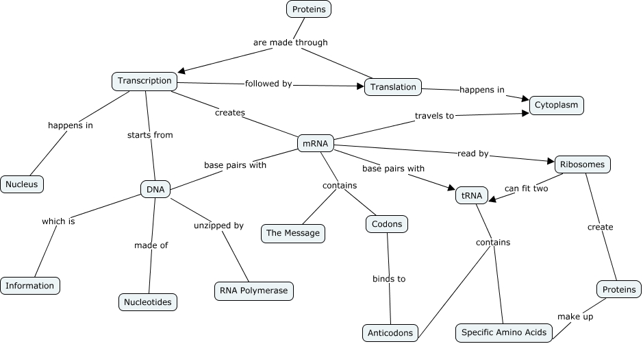 This Concept Map, created with IHMC CmapTools, has information related to: Protein Synthesis, tRNA contains Specific Amino Acids, mRNA contains The Message, mRNA base pairs with tRNA, mRNA travels to Cytoplasm, mRNA contains Codons, Proteins are made through Translation, DNA made of Nucleotides, Transcription starts from DNA, Transcription creates mRNA, DNA which is Information, mRNA read by Ribosomes, Transcription followed by Translation, Proteins are made through Transcription, Ribosomes create Proteins, DNA unzipped by RNA Polymerase, Codons binds to Anticodons, tRNA contains Anticodons, Ribosomes can fit two tRNA, Translation happens in Cytoplasm, Proteins make up Specific Amino Acids
