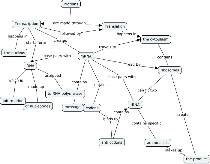 This Concept Map, created with IHMC CmapTools, has information related to: Proteins, anti codons contains tRNA, mRNA contains message, mRNA base pairs with tRNA, codons binds to anti codons, Transcription happens in the nucleus, Proteins are made through Translation, DNA unzipped to RNA polymerase, Proteins are made through Transcription, DNA made up of nucleotides, mRNA base pairs with DNA, Translation happens in the cytoplasm, Transcription starts form DNA, DNA which is information, Transcription followed by Translation, ribosomes create the product, amino acids makes up the product, mRNA read by ribosomes, Transcription creates mRNA, ribosomes can fit two tRNA, mRNA travels to the cytoplasm