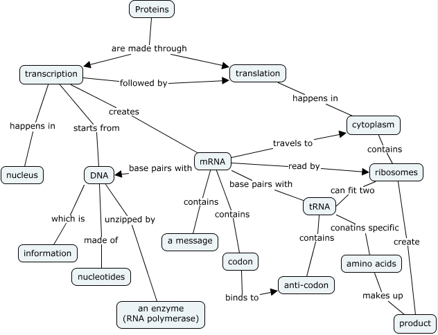 This Concept Map, created with IHMC CmapTools, has information related to: Protein Synthesis, Proteins are made through translation, mRNA travels to cytoplasm, mRNA contains codon, mRNA read by ribosomes, DNA which is information, amino acids makes up product, cytoplasm contains ribosomes, DNA made of nucleotides, mRNA contains a message, transcription followed by translation, Proteins are made through transcription, transcription creates mRNA, translation happens in cytoplasm, tRNA contains anti-codon, tRNA conatins specific amino acids, transcription happens in nucleus, codon binds to anti-codon, mRNA base pairs with DNA, mRNA base pairs with tRNA, transcription starts from DNA