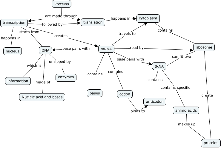 This Concept Map, created with IHMC CmapTools, has information related to: DNA Making, ribosome create proteins, translation happens in cytoplasm, DNA made of Nucleic acid and bases, DNA unzipped by enzymes, mRNA travels to cytoplasm, transcription creates mRNA, cytoplasm contains ribosome, mRNA base pairs with tRNA, mRNA contains codon, tRNA contains specific animo acids, animo acids makes up proteins, transcription followed by translation, transcription starts from DNA, ribosome can fit two tRNA, DNA which is information, mRNA base pairs with DNA, tRNA contains anticodon, mRNA contains bases, transcription happens in nucleus, Proteins are made through translation