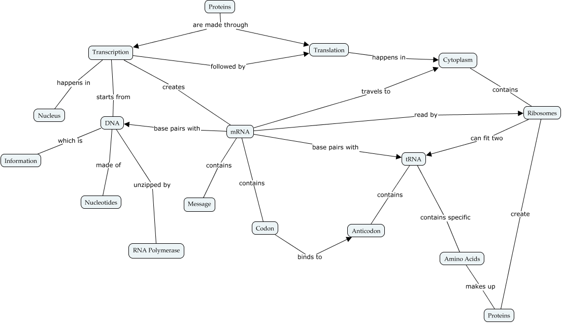 This Concept Map, created with IHMC CmapTools, has information related to: Protein Synthesis, DNA unzipped by RNA Polymerase, mRNA base pairs with tRNA, mRNA travels to Cytoplasm, tRNA contains specific Amino Acids, mRNA contains Codon, DNA which is Information, mRNA contains Message, Transcription creates mRNA, Amino Acids makes up Proteins, Ribosomes can fit two tRNA, Proteins are made through Transcription, Codon binds to Anticodon, tRNA contains Anticodon, Transcription followed by Translation, Ribosomes create Proteins, Transcription happens in Nucleus, Cytoplasm contains Ribosomes, Transcription starts from DNA, mRNA base pairs with DNA, Proteins are made through Translation