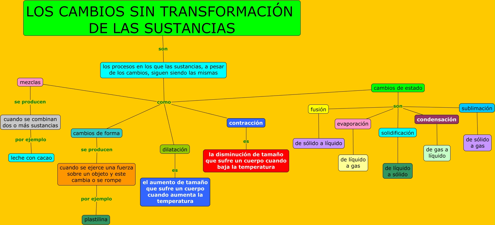 Este Cmap, tiene información relacionada con: Los cambios sin transformación de las sustancias, sublimación de sólido a gas, cambios de forma se producen cuando se ejerce una fuerza sobre un objeto y este cambia o se rompe, LOS CAMBIOS SIN TRANSFORMACIÓN DE LAS SUSTANCIAS son los procesos en los que las sustancias, a pesar de los cambios, siguen siendo las mismas, cambios de estado son sublimación, los procesos en los que las sustancias, a pesar de los cambios, siguen siendo las mismas como cambios de estado, fusión de sólido a líquido, dilatación es el aumento de tamaño que sufre un cuerpo cuando aumenta la temperatura, los procesos en los que las sustancias, a pesar de los cambios, siguen siendo las mismas como cambios de forma, solidificación de líquido a sólido, contracción es la disminución de tamaño que sufre un cuerpo cuando baja la temperatura, los procesos en los que las sustancias, a pesar de los cambios, siguen siendo las mismas como contracción, los procesos en los que las sustancias, a pesar de los cambios, siguen siendo las mismas como mezclas, cambios de estado son evaporación, evaporación de líquido a gas, cuando se ejerce una fuerza sobre un objeto y este cambia o se rompe por ejemplo plastilina, los procesos en los que las sustancias, a pesar de los cambios, siguen siendo las mismas como dilatación, cambios de estado son fusión, cuando se combinan dos o más sustancias por ejemplo leche con cacao, mezclas se producen cuando se combinan dos o más sustancias, cambios de estado son solidificación