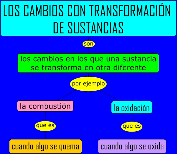 Este Cmap, tiene información relacionada con: Los cambios con transformación de sustancias, la oxidación que es cuando algo se oxida, los cambios en los que una sustancia se transforma en otra diferente por ejemplo la oxidación, los cambios en los que una sustancia se transforma en otra diferente por ejemplo la combustión, LOS CAMBIOS CON TRANSFORMACIÓN DE SUSTANCIAS son los cambios en los que una sustancia se transforma en otra diferente, la combustión que es cuando algo se quema