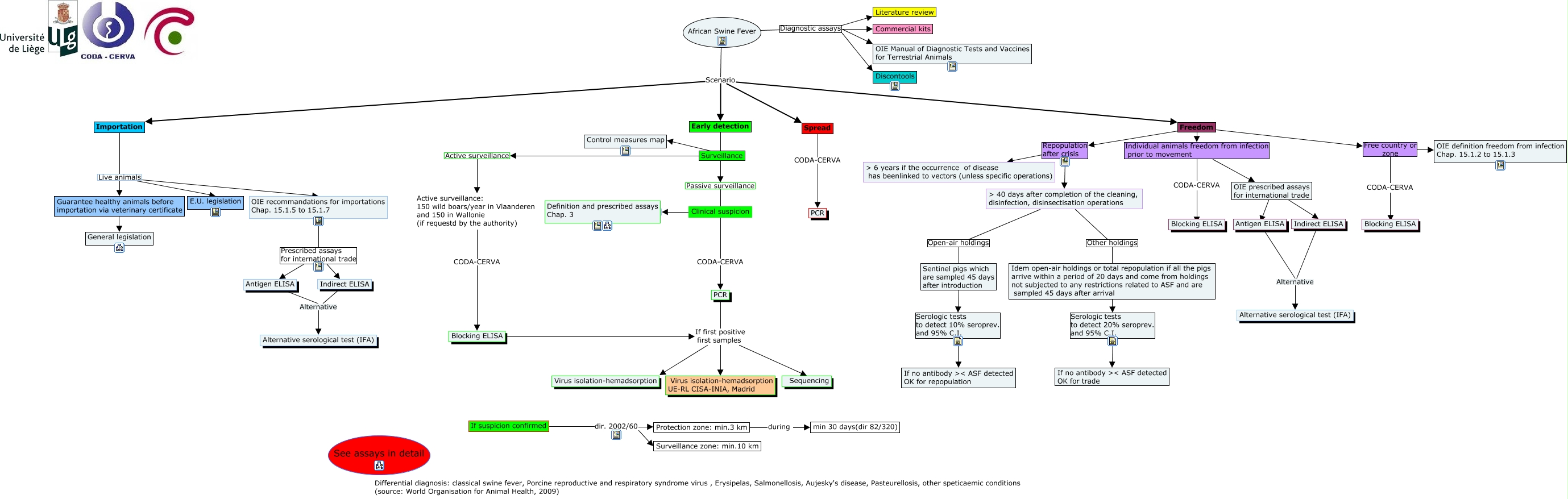 This Concept Map, created with IHMC CmapTools, has information related to: African Swine Fever VF, Indirect ELISA Alternative Alternative serological test (IFA), OIE prescribed assays for international trade ???? Indirect ELISA, Spread CODA-CERVA PCR, > 40 days after completion of the cleaning, disinfection, disinsectisation operations Other holdings Idem open-air holdings or total repopulation if all the pigs arrive within a period of 20 days and come from holdings not subjected to any restrictions related to ASF and are sampled 45 days after arrival, Freedom Repopulation after crisis > 40 days after completion of the cleaning, disinfection, disinsectisation operations, Antigen ELISA Alternative Alternative serological test (IFA), African Swine Fever Scenario Early detection, Clinical suspicion CODA-CERVA PCR, OIE prescribed assays for international trade ???? Antigen ELISA, Blocking ELISA If first positive first samples Virus isolation-hemadsorption, Surveillance ???? Control measures map, African Swine Fever Scenario Spread, PCR If first positive first samples Virus isolation-hemadsorption UE-RL CISA-INIA, Madrid, Freedom Free country or zone CODA-CERVA, Sentinel pigs which are sampled 45 days after introduction Serologic tests to detect 10% seroprev. and 95% C.I. If no antibody >< ASF detected OK for repopulation, African Swine Fever Diagnostic assays OIE Manual of Diagnostic Tests and Vaccines for Terrestrial Animals, Idem open-air holdings or total repopulation if all the pigs arrive within a period of 20 days and come from holdings not subjected to any restrictions related to ASF and are sampled 45 days after arrival Serologic tests to detect 20% seroprev. and 95% C.I. If no antibody >< ASF detected OK for trade, Importation Live animals E.U. legislation, CODA-CERVA ???? Blocking ELISA, Early detection Passive surveillance Clinical suspicion
