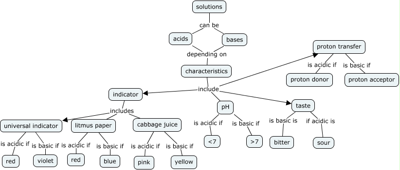 This Concept Map, created with IHMC CmapTools, has information related to: acids and bases, acids depending on characteristics, solutions can be bases, litmus paper is acidic if red, pH is acidic if ɟ, indicator includes litmus paper, indicator includes cabbage juice, indicator includes universal indicator, cabbage juice is basic if yellow, pH is basic if ɳ, universal indicator is acidic if red, characteristics include taste, litmus paper is basic if blue, characteristics include proton transfer, taste if acidic is sour, proton transfer is basic if proton acceptor, taste is basic is bitter, bases depending on characteristics, characteristics include indicator, cabbage juice is acidic if pink, universal indicator is basic if violet