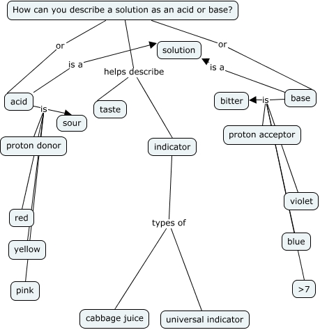 This Concept Map, created with IHMC CmapTools, has information related to: acid or base, How can you describe a solution as an acid or base? helps describe indicator, base is a solution, How can you describe a solution as an acid or base? helps describe taste, How can you describe a solution as an acid or base? or acid, acid is a solution, base is blue, acid is red, base is proton acceptor, acid is proton donor, acid is yellow, indicator types of cabbage juice, acid is pink, base is bitter, indicator types of universal indicator, acid is sour, base is violet, How can you describe a solution as an acid or base? or base, base is ɳ