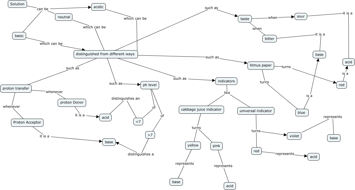 This Concept Map, created with IHMC CmapTools, has information related to: Acid or Base, bitter it is a base, proton Donor it is a acid, ɳ distinguishes a base, violet represents base, universal indicator turns violet, distinguished from different ways such as taste, distinguished from different ways such as proton transfer, universal indicator turns red, distinguished from different ways such as ph level, Solution can be neutral, red represents acid, Solution can be acidic, indicators like cabbage juice indicator, Solution can be basic, red is a acid, neutral which can be distinguished from different ways, distinguished from different ways such as litmus paper, litmus paper turns red, sour it is a acid, proton transfer whenever Proton Acceptor