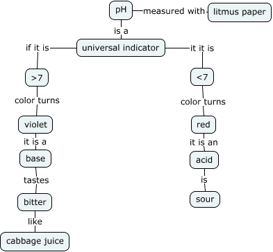This Concept Map, created with IHMC CmapTools, has information related to: Acid or Base, base tastes bitter, universal indicator it it is ɟ, ɳ color turns violet, bitter like cabbage juice, pH is a universal indicator, red it is an acid, acid is sour, pH measured with litmus paper, ɟ color turns red, violet it is a base, universal indicator if it is ɳ