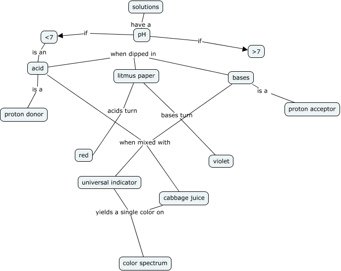 This Concept Map, created with IHMC CmapTools, has information related to: How can you describe a solution as an acid or a base, acid when mixed with cabbage juice, acid when dipped in litmus paper, pH if ɟ, solutions have a pH, litmus paper bases turn violet, cabbage juice yields a single color on color spectrum, litmus paper acids turn red, bases when mixed with cabbage juice, pH if ɳ, acid when mixed with universal indicator, universal indicator yields a single color on color spectrum, bases when dipped in litmus paper, acid is a proton donor, bases when mixed with universal indicator, bases is a proton acceptor, ɟ is an acid
