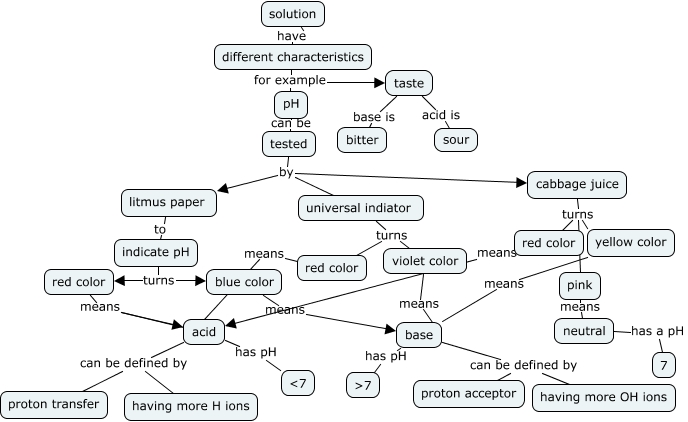 This Concept Map, created with IHMC CmapTools, has information related to: Acid-Base concept map, tested by litmus paper, indicate pH turns red color, acid has pH ɟ, red color means acid, taste base is bitter, base can be defined by having more OH ions, red color means acid, red color means acid, neutral has a pH 7, taste acid is sour, tested by cabbage juice, cabbage juice turns pink, violet color means base, base has pH ɳ, indicate pH turns blue color, different characteristics for example taste, different characteristics for example pH, acid can be defined by proton transfer, tested by universal indiator, solution have different characteristics