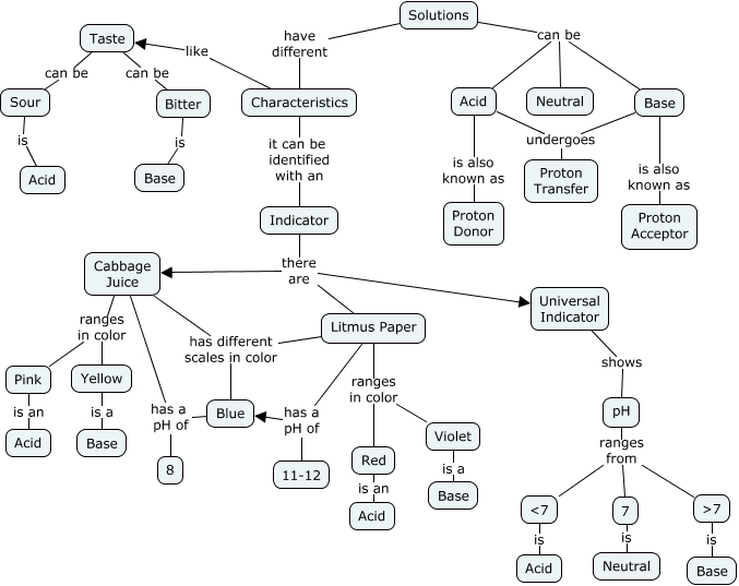 This Concept Map, created with IHMC CmapTools, has information related to: Acids and Bases, Characteristics it can be identified with an Indicator, Violet is a Base, Pink is an Acid, 7 is Neutral, Solutions can be Acid, Litmus Paper has a pH of 11-12, Bitter is Base, Solutions have different Characteristics, Red is an Acid, Taste can be Bitter, Indicator there are Universal Indicator, Litmus Paper ranges in color Violet, Universal Indicator shows pH, Yellow is a Base, Blue has a pH of 8, pH ranges from ɳ, Cabbage Juice ranges in color Pink, pH ranges from 7, Taste can be Sour, Acid is also known as Proton Donor