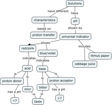 This Concept Map, created with IHMC CmapTools, has information related to: Acids and Bases, bitter in taste, base is proton acceptor, red/pink indicates acid, acid is proton donor, pH shown by universal indicator, universal indicator includes cabbage juice, sour in taste, base is bitter, universal indicator shows blue/violet, Solutions have different characteristics, universal indicator includes litmus paper, Solutions have pH, acid is sour, universal indicator shows red/pink, base has a pH ɳ, acid has a pH ɟ, characteristics based on proton transfer, blue/violet indicates base