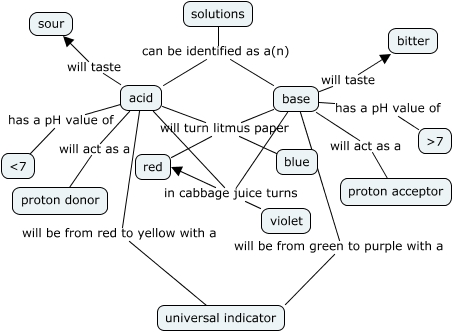 This Concept Map, created with IHMC CmapTools, has information related to: acid v. base, acid will taste sour, base in cabbage juice turns violet, acid will turn litmus paper blue, base will act as a proton acceptor, acid will be from red to yellow with a universal indicator, base has a pH value of ɳ, base will taste bitter, acid will turn litmus paper red, solutions can be identified as a(n) acid, acid has a pH value of ɟ, base will turn litmus paper red, acid in cabbage juice turns violet, base will turn litmus paper blue, acid in cabbage juice turns red, solutions can be identified as a(n) base, base will be from green to purple with a universal indicator, base in cabbage juice turns red, acid will act as a proton donor