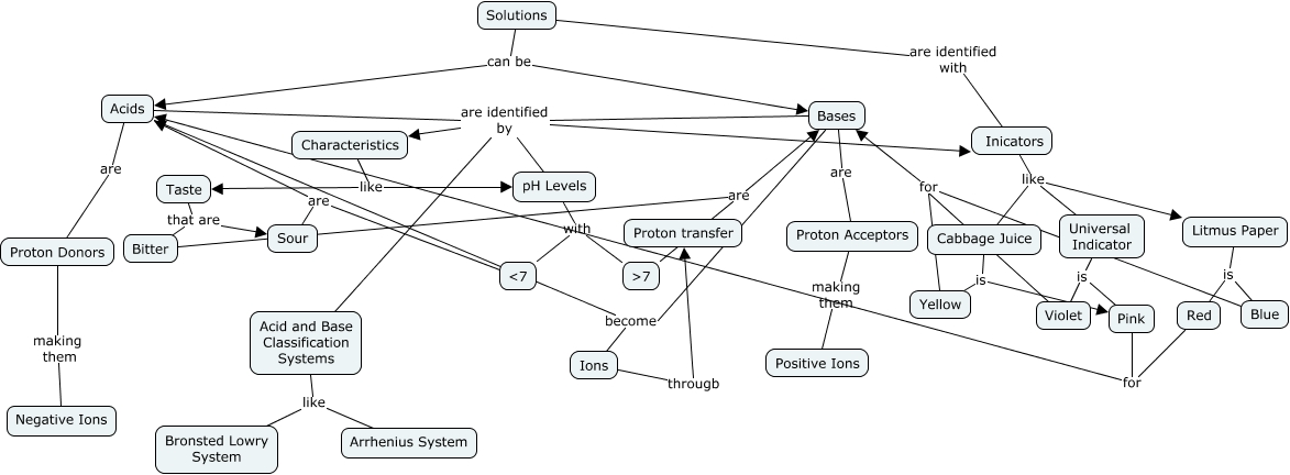 This Concept Map, created with IHMC CmapTools, has information related to: Acids and Bases, Characteristics like Taste, Cabbage Juice is Yellow, Bases are identified by Acid and Base Classification Systems, Acids are identified by pH Levels, Universal Indicator is Pink, Acid and Base Classification Systems like Arrhenius System, Taste that are Sour, Solutions are identified with Inicators, Acids are identified by Acid and Base Classification Systems, ɳ are Bases, Inicators like Litmus Paper, Bases are identified by Inicators, Bitter are Bases, Red for Acids, Acids are Proton Donors, Inicators like Universal Indicator, Solutions can be Acids, Acids become Ions, Litmus Paper is Blue, Pink for Acids