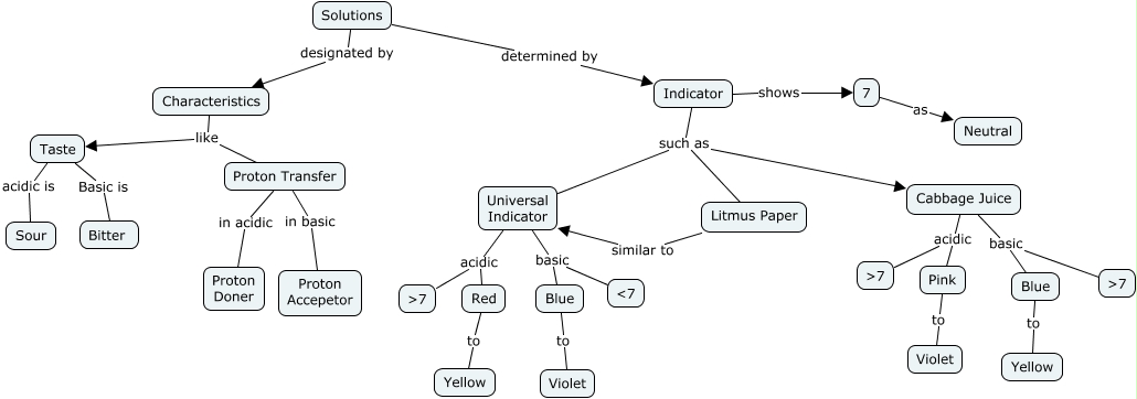 This Concept Map, created with IHMC CmapTools, has information related to: Acid and Bases In Solutions, Indicator such as Cabbage Juice, Indicator such as Litmus Paper, Universal Indicator acidic Red, Litmus Paper similar to Universal Indicator, Cabbage Juice basic Blue, Solutions determined by Indicator, Solutions designated by Characteristics, Indicator shows 7, Taste acidic is Sour, Characteristics like Proton Transfer, Universal Indicator acidic ɳ, Cabbage Juice basic ɳ, Universal Indicator basic ɟ, Taste Basic is Bitter, Characteristics like Taste, Blue to Yellow, Proton Transfer in basic Proton Accepetor, Cabbage Juice acidic ɳ, Pink to Violet, Red to Yellow