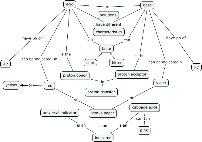 This Concept Map, created with IHMC CmapTools, has information related to: acids vs bases, base can be indicatedin violet, acid are solutions, acid can taste, acid have ph of ɟ, red on litmus paper, base are solutions, base can taste, taste ???? sour, base have different characteristics, acid is the proton donor, acid can be indicated in red, litmus paper is an indicator, universal indicator is an indicator, base is the proton acceptor, cabbage juice can turn pink, proton donor in proton transfer, acid have different characteristics, proton acceptor in proton transfer, red or yellow, violet on litmus paper