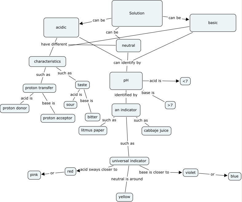 This Concept Map, created with IHMC CmapTools, has information related to: acid or base, an indicator such as cabbaje juice, Solution can be acidic, Solution can be basic, an indicator such as litmus paper, neutral have different characteristics, pH base is ɳ, characteristics such as taste, acidic can identify by pH, characteristics such as proton transfer, pH acid is ɟ, neutral can identify by pH, red or pink, proton transfer acid is proton donor, basic can identify by pH, proton transfer base is proton acceptor, pH identified by an indicator, taste acid is sour, basic have different characteristics, acidic have different characteristics, universal indicator neutral is around yellow