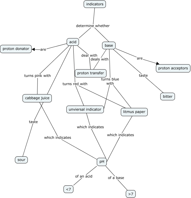 This Concept Map, created with IHMC CmapTools, has information related to: acid-base concept map, acid turns red with litmus paper, acid turns pink with cabbage juice, pH of an acid ɟ, base deals with proton transfer, cabbage juice which indicates pH, acid are proton donator, indicators determine whether acid, indicators determine whether base, base taste bitter, unviersal indicator which indicates pH, litmus paper which indicates pH, base are proton acceptors, acid deal with proton transfer, base turns blue with litmus paper, base turns blue with unviersal indicator, acid taste sour, pH of a base ɳ, acid turns red with unviersal indicator