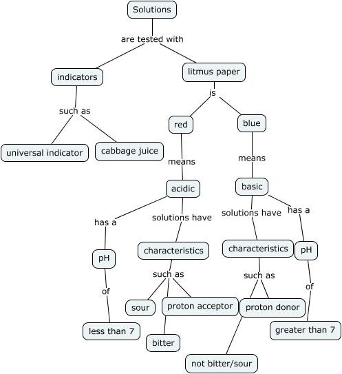 This Concept Map, created with IHMC CmapTools, has information related to: Acids and bases, indicators such as cabbage juice, acidic solutions have characteristics, litmus paper is red, indicators such as universal indicator, characteristics such as sour, litmus paper is blue, basic has a pH, characteristics such as proton donor, pH of greater than 7, characteristics such as proton acceptor, red means acidic, Solutions are tested with litmus paper, characteristics such as not bitter/sour, blue means basic, Solutions are tested with indicators, pH of less than 7, basic solutions have characteristics, characteristics such as bitter, acidic has a pH