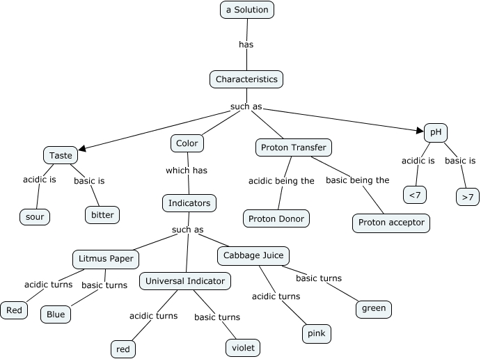 This Concept Map, created with IHMC CmapTools, has information related to: Acid-Base, Indicators such as Litmus Paper, Color which has Indicators, a Solution has Characteristics, Characteristics such as Proton Transfer, Cabbage Juice basic turns green, Universal Indicator basic turns violet, Taste basic is bitter, Cabbage Juice acidic turns pink, Indicators such as Universal Indicator, Indicators such as Cabbage Juice, Litmus Paper basic turns Blue, Characteristics such as pH, Proton Transfer basic being the Proton acceptor, Proton Transfer acidic being the Proton Donor, pH basic is ɳ, Characteristics such as Color, Litmus Paper acidic turns Red, Taste acidic is sour, pH acidic is ɟ, Characteristics such as Taste