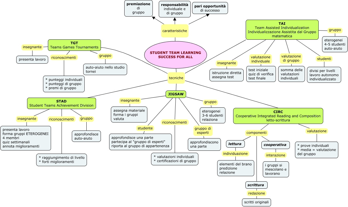 Questa Cmap, creata con IHMC CmapTools, contiene informazioni relative a: TeamLearning, JIGSAW studente approfondisce una parte partecipa al "gruppo di esperti" riporta al gruppo di appartenenza, STAD Student Teams Achievement Division riconoscimenti * raggiungimento di livello * forti miglioramenti, STUDENT TEAM LEARNING SUCCESS FOR ALL tecniche JIGSAW, STUDENT TEAM LEARNING SUCCESS FOR ALL caratteristiche premiazione di gruppo, TAI Team Assisted Individualization Individualizzazione Assistita dal Gruppo matematica gruppo eterogenei 4-5 studenti auto-aiuto, CIRC Cooperative Integrated Reading and Composition letto-scrittura componenti scrittura, scrittura redazione scritti originali, STUDENT TEAM LEARNING SUCCESS FOR ALL tecniche TAI Team Assisted Individualization Individualizzazione Assistita dal Gruppo matematica, STUDENT TEAM LEARNING SUCCESS FOR ALL caratteristiche responsabilità individuale e di gruppo, TAI Team Assisted Individualization Individualizzazione Assistita dal Gruppo matematica valutazione individuale test iniziale quiz di verifica test finale, cooperativa interazione i gruppi si mescolano e lavorano, TGT Teams Games Tournaments gruppo auto-aiuto nello studio tornei, lettura individuazione elementi del brano predizione relazione, STAD Student Teams Achievement Division insegnante presenta lavoro forma gruppi ETEROGENEI 4 membri quiz settimanali annota miglioramenti, CIRC Cooperative Integrated Reading and Composition letto-scrittura valutazione * prove individuali * media = valutazione del gruppo, STUDENT TEAM LEARNING SUCCESS FOR ALL tecniche TGT Teams Games Tournaments, JIGSAW gruppo di esperti approfondiscono una parte, TAI Team Assisted Individualization Individualizzazione Assistita dal Gruppo matematica insegnante istruzione diretta assegna test, JIGSAW gruppo eterogenei 3-6 studenti relaziona, TGT Teams Games Tournaments insegnante presenta lavoro