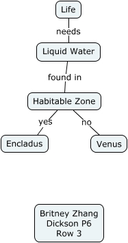 This Concept Map, created with IHMC CmapTools, has information related to: Requirements for Life, Habitable Zone no Venus, Habitable Zone yes Encladus, Liquid Water found in Habitable Zone, Life needs Liquid Water