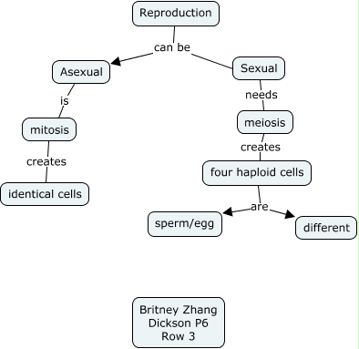 This Concept Map, created with IHMC CmapTools, has information related to: Reproduction, mitosis creates identical cells, meiosis creates four haploid cells, Reproduction can be Asexual, Reproduction can be Sexual, Sexual needs meiosis, four haploid cells are different, Asexual is mitosis, four haploid cells are sperm/egg
