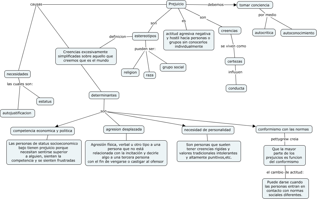 Este Cmap, tiene información relacionada con: prejuicio, necesidades las cuales son: autojustificacion, determinantes son agresion desplazada, tomar conciencia por medio autoconocimiento, estereotipos pueden ser: grupo social, necesidades las cuales son: estatus, estereotipos definicion Creencias excesivamente simplificadas sobre aquello que creemos que es el mundo, agresion desplazada ???? Agresión física, verbal u otro tipo a una persona que no está relacionada con la incitación y decirle algo a una tercera persona con el fin de vengarse o castigar al ofensor, estereotipos pueden ser: raza, Prejuicio causas necesidades, certezas influyen conducta, competencia economica y politica ???? Las personas de status socioeconomico bajo tienen prejuicio porque necesitan sentirse superior a alguien, sienten la competencia y se sienten frustradas, determinantes son competencia economica y politica, Que la mayor parte de los prejuicios es funcion del conformismo el cambio de actitud: Puede darse cuando las personas entran en contacto con normas sociales diferentes., estereotipos pueden ser: religion, tomar conciencia por medio autocritica, determinantes son conformismo con las normas, determinantes son necesidad de personalidad, Prejuicio es actitud agresiva negativa y hostil hacia personas o grupos sin conocerlos individualmente, Prejuicio debemos tomar conciencia, Prejuicio son creencias