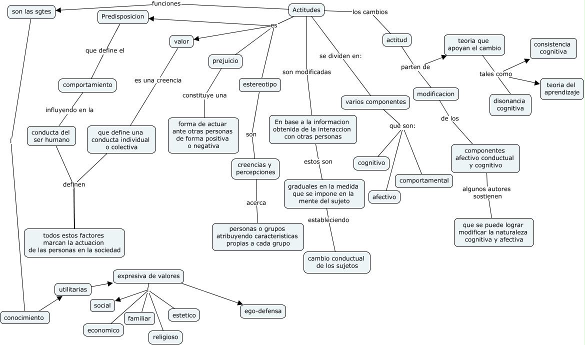 Este Cmap, tiene información relacionada con: Actitudes, conocimiento ???? utilitarias, expresiva de valores l social, graduales en la medida que se impone en la mente del sujeto estableciendo cambio conductual de los sujetos, creencias y percepciones acerca personas o grupos atribuyendo caracteristicas propias a cada grupo, utilitarias ???? expresiva de valores, valor es una creencia que define una conducta individual o colectiva, Actitudes son modificadas En base a la informacion obtenida de la interaccion con otras personas, Actitudes es Predisposicion, varios componentes que son: afectivo, estereotipo son creencias y percepciones, varios componentes que son: cognitivo, teoria que apoyan el cambio tales como teoria del aprendizaje, comportamiento influyendo en la conducta del ser humano, actitud parten de modificacion, Actitudes los cambios actitud, modificacion de los componentes afectivo conductual y cognitivo, conducta del ser humano l todos estos factores marcan la actuacion de las personas en la sociedad, Actitudes es estereotipo, teoria que apoyan el cambio tales como consistencia cognitiva, expresiva de valores l economico