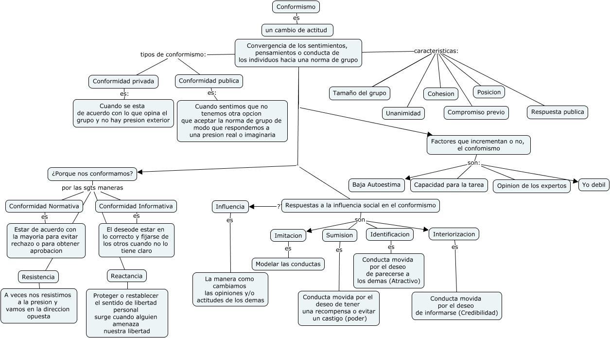 Este Cmap, tiene información relacionada con: Conformismo, Factores que incrementan o no, el confomismo son: Baja Autoestima, Resistencia ???? A veces nos resistimos a la presion y vamos en la direccion opuesta, Factores que incrementan o no, el confomismo son: Opinion de los expertos, Convergencia de los sentimientos, pensamientos o conducta de los individuos hacia una norma de grupo caracteristicas: Compromiso previo, Convergencia de los sentimientos, pensamientos o conducta de los individuos hacia una norma de grupo tipos de conformismo: Conformidad privada, Respuestas a la influencia social en el conformismo son Sumision, Convergencia de los sentimientos, pensamientos o conducta de los individuos hacia una norma de grupo caracteristicas: Unanimidad, Convergencia de los sentimientos, pensamientos o conducta de los individuos hacia una norma de grupo caracteristicas: Tamaño del grupo, Factores que incrementan o no, el confomismo son: Capacidad para la tarea, ¿Porque nos conformamos? por las sgts maneras Resistencia, Respuestas a la influencia social en el conformismo son Imitacion, Convergencia de los sentimientos, pensamientos o conducta de los individuos hacia una norma de grupo caracteristicas: Tamaño del grupo, Conformidad Normativa es Estar de acuerdo con la mayoria para evitar rechazo o para obtener aprobacion, Identificacion es Conducta movida por el deseo de parecerse a los demas (Atractivo), Respuestas a la influencia social en el conformismo son Identificacion, Convergencia de los sentimientos, pensamientos o conducta de los individuos hacia una norma de grupo caracteristicas: Cohesion, Conformismo es un cambio de actitud, Convergencia de los sentimientos, pensamientos o conducta de los individuos hacia una norma de grupo l Factores que incrementan o no, el confomismo, Conformidad privada es: Cuando se esta de acuerdo con lo que opina el grupo y no hay presion exterior, Factores que incrementan o no, el confomismo son: Yo debil