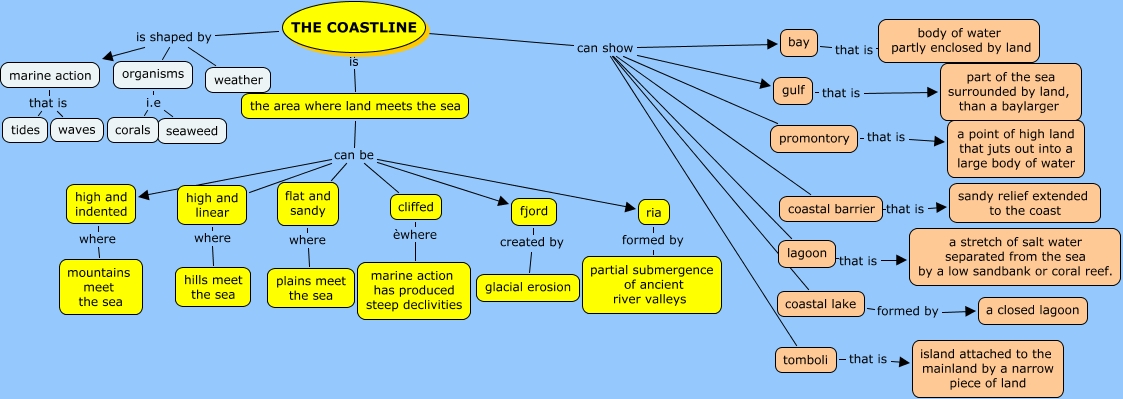 Questa Cmap, creata con IHMC CmapTools, contiene informazioni relative a: The coastline, THE COASTLINE is the area where land meets the sea, the area where land meets the sea can be flat and sandy, tomboli that is island attached to the mainland by a narrow piece of land, the area where land meets the sea can be cliffed, THE COASTLINE can show bay, marine action that is tides, THE COASTLINE is shaped by marine action, ria formed by partial submergence of ancient river valleys, THE COASTLINE can show coastal barrier, flat and sandy where plains meet the sea, THE COASTLINE can show lagoon, THE COASTLINE is shaped by weather, the area where land meets the sea can be ria, organisms i.e corals, lagoon that is a stretch of salt water separated from the sea by a low sandbank or coral reef., coastal lake formed by a closed lagoon, the area where land meets the sea can be fjord, THE COASTLINE can show promontory, the area where land meets the sea can be high and indented, promontory that is a point of high land that juts out into a large body of water