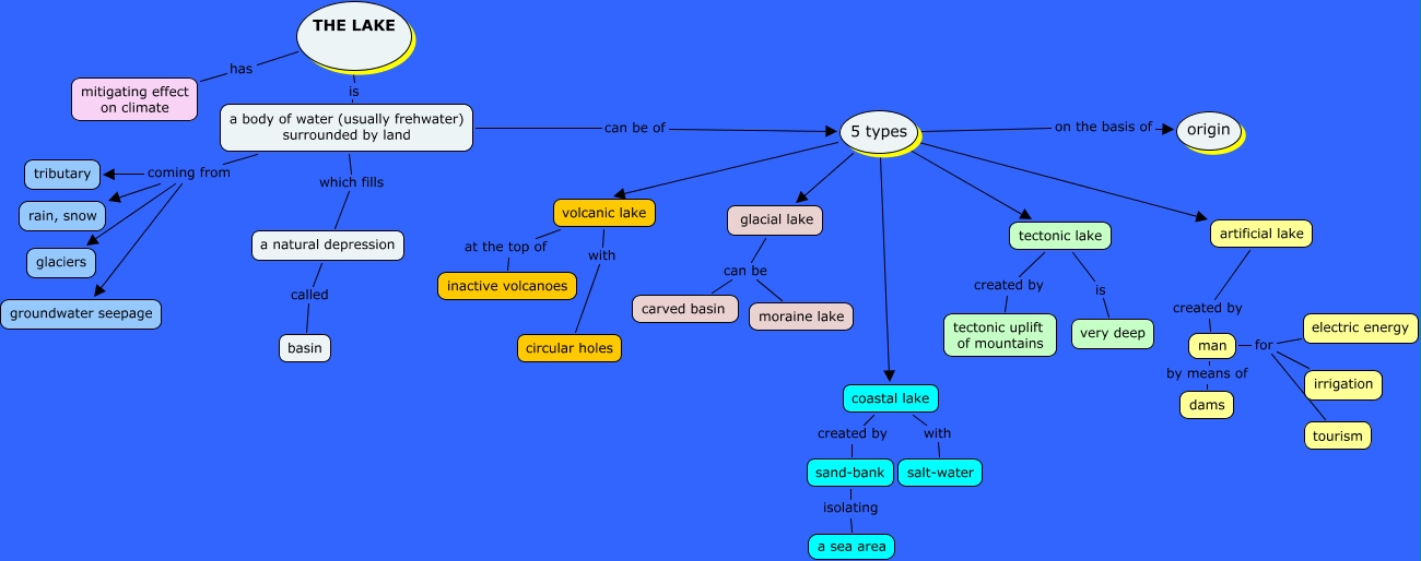 Questa Cmap, creata con IHMC CmapTools, contiene informazioni relative a: The lake, a body of water (usually frehwater) surrounded by land which fills a natural depression, a body of water (usually frehwater) surrounded by land coming from groundwater seepage, THE LAKE has mitigating effect on climate, man for irrigation, sand-bank isolating a sea area, a body of water (usually frehwater) surrounded by land coming from glaciers, 5 types glacial lake, a body of water (usually frehwater) surrounded by land coming from rain, snow, volcanic lake at the top of inactive volcanoes, 5 types artificial lake, glacial lake can be carved basin, coastal lake with salt-water, volcanic lake with circular holes, artificial lake created by man, 5 types volcanic lake, a body of water (usually frehwater) surrounded by land coming from tributary, glacial lake can be moraine lake, tectonic lake is very deep, coastal lake created by sand-bank, man by means of dams