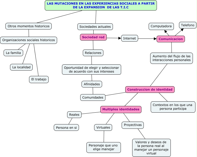 Este Cmap, tiene información relacionada con: Las mutaciones en las experiencias sociales a partir de la expansion de las TIC.cmap, LAS MUTACIONES EN LAS EXPERIENCIAS SOCIALES A PARTIR DE LA EXPANSION DE LAS T.I.C ???? Sociedades actuales, Relaciones ???? Oportunidad de elegir y seleccionar de acuerdo con sus intereses, Multiples identidades ???? Proyectivas, Aumento del flujo de las interacciones personales ???? Construccion de identidad, Proyectivas ???? Valores y deseos de la persona real al manejar un personaje virtual, Sociedad red ???? Internet, Otros momentos historicos ???? La familia, Multiples identidades ???? Persona en si, Comunidades ???? Construccion de identidad, Multiples identidades ???? Virtuales, Otros momentos historicos ???? Organizaciones sociales historicos, Construccion de identidad ???? Multiples identidades, Sociedades actuales ???? Sociedad red, Oportunidad de elegir y seleccionar de acuerdo con sus intereses ???? Afinidades, Comunicacion ???? Computadora, LAS MUTACIONES EN LAS EXPERIENCIAS SOCIALES A PARTIR DE LA EXPANSION DE LAS T.I.C ???? Otros momentos historicos, Virtuales ???? Personaje que uno elige manejar, Organizaciones sociales historicos ???? El trabajo, Organizaciones sociales historicos ???? La localidad, Comunicacion ???? Telefono