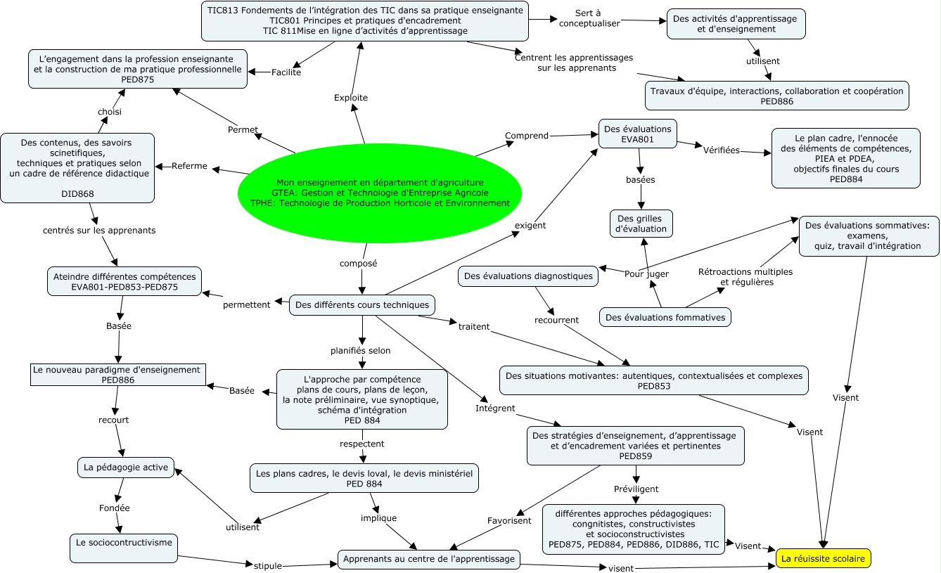 Cette carte de concepts créée avec IHMC CmapTools traite de: Hamid Intégration E16, Des différents cours techniques planifiés selon L'approche par compétence plans de cours, plans de leçon, la note préliminaire, vue synoptique, schéma d'intégration PED 884, Des activités d'apprentissage et d'enseignement utilisent Travaux d'équipe, interactions, collaboration et coopération PED886, Des différents cours techniques permettent Ateindre différentes compétences EVA801-PED853-PED875, différentes stratégies d'enseignement PED859 Favorisent Apprenants au centre de l'apprentissage, L'approche par compétence plans de cours, plans de leçon, la note préliminaire, vue synoptique, schéma d'intégration PED 884 Basée Le nouveau paradigme d'enseignement PED886, Mon enseignement en département d'agriculture GTEA: Gestion et Technologie d'Entreprise Agricole TPHE: Technologie de Production Horticole et Environnement Comprend Des évaluations EVA801, Des évaluations EVA801 basées Des grilles d'évaluation, Des situations motivantes: autentiques, contextualisées et complexes PED853 Visent La réuissite scolaire, Des évaluations diagnostiques recourrent Des situations motivantes: autentiques, contextualisées et complexes PED853, Mon enseignement en département d'agriculture GTEA: Gestion et Technologie d'Entreprise Agricole TPHE: Technologie de Production Horticole et Environnement Referme Des contenus, des savoirs scinetifiques, techniques et pratiques selon un cadre de référence didactique DID868, Mon enseignement en département d'agriculture GTEA: Gestion et Technologie d'Entreprise Agricole TPHE: Technologie de Production Horticole et Environnement Permet L’engagement dans la profession enseignante et la construction de ma pratique professionnelle PED875, Le sociocontructivisme stipule Apprenants au centre de l'apprentissage, TIC813 Fondements de l’intégration des TIC dans sa pratique enseignante TIC801 Principes et pratiques d'encadrement TIC 811Mise en ligne d’activités d’apprentissage Facilite L’engagement dans la profession enseignante et la construction de ma pratique professionnelle PED875, Des évaluations fommatives Pour juger Des grilles d'évaluation, Des différents cours techniques Intégrent Des stratégies d’enseignement, d’apprentissage et d’encadrement variées et pertinentes PED859, TIC813 Fondements de l’intégration des TIC dans sa pratique enseignante TIC801 Principes et pratiques d'encadrement TIC 811Mise en ligne d’activités d’apprentissage Centrent les apprentissages sur les apprenants Travaux d'équipe, interactions, collaboration et coopération PED886, Mon enseignement en département d'agriculture GTEA: Gestion et Technologie d'Entreprise Agricole TPHE: Technologie de Production Horticole et Environnement composé Des différents cours techniques, Ateindre différentes compétences EVA801-PED853-PED875 Basée Le nouveau paradigme d'enseignement PED886, Les plans cadres, le devis loval, le devis ministériel PED 884 implique Apprenants au centre de l'apprentissage, Les plans cadres, le devis loval, le devis ministériel PED 884 utilisent La pédagogie active