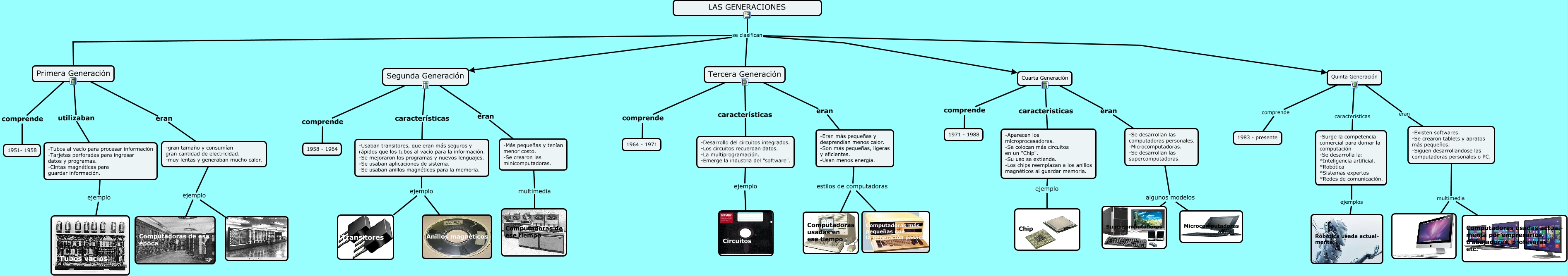Este Cmap, tiene información relacionada con: Las Generaciones, -Se desarrollan las computadoras personales. -Microcomputadoras. -Se desarrollan las supercomputadoras. algunos modelos Microcomputadoras, LAS GENERACIONES se clasifican Primera Generación, Quinta Generación comprende 1983 - presente, -Desarrollo del circuitos integrados. -Los circuitos recuerdan datos. -La multiprogramación. -Emerge la industria del "software". ejemplo Circuitos, -Aparecen los microprocesadores. -Se colocan más circuitos en un "Chip". -Su uso se extiende. -Los chips reemplazan a los anillos magnéticos al guardar memoria. ejemplo Chip, -Tubos al vacío para procesar información -Tarjetas perforadas para ingresar datos y programas. -Cintas magnéticas para guardar información. ejemplo Tubos vacíos, -gran tamaño y consumían gran cantidad de electricidad. -muy lentas y generaban mucho calor. ejemplo Computadoras de esa época, Quinta Generación características -Surge la competencia comercial para domar la computación -Se desarrolla la: *Inteligencia artificial. *Robótica *Sistemas expertos *Redes de comunicación., Primera Generación eran -gran tamaño y consumían gran cantidad de electricidad. -muy lentas y generaban mucho calor., Primera Generación comprende 1951- 1958, -Usaban transitores, que eran más seguros y rápidos que los tubos al vacío para la información. -Se mejoraron los programas y nuevos lenguajes. -Se usaban aplicaciones de sistema. -Se usaban anillos magnéticos para la memoria. ejemplo Transitores, Segunda Generación eran -Más pequeñas y tenían menor costo. -Se crearon las minicomputadoras., Segunda Generación características -Usaban transitores, que eran más seguros y rápidos que los tubos al vacío para la información. -Se mejoraron los programas y nuevos lenguajes. -Se usaban aplicaciones de sistema. -Se usaban anillos magnéticos para la memoria., Cuarta Generación características -Aparecen los microprocesadores. -Se colocan más circuitos en un "Chip". -Su uso se extiende. -Los chips reemplazan a los anillos magnéticos al guardar memoria., -gran tamaño y consumían gran cantidad de electricidad. -muy lentas y generaban mucho calor. ejemplo, Tercera Generación eran -Eran más pequeñas y desprendían menos calor. -Son más pequeñas, ligeras y eficientes. -Usan menos energía., Primera Generación utilizaban -Tubos al vacío para procesar información -Tarjetas perforadas para ingresar datos y programas. -Cintas magnéticas para guardar información., Cuarta Generación comprende 1971 - 1988, -Usaban transitores, que eran más seguros y rápidos que los tubos al vacío para la información. -Se mejoraron los programas y nuevos lenguajes. -Se usaban aplicaciones de sistema. -Se usaban anillos magnéticos para la memoria. ejemplo Anillos magnéticos, Segunda Generación comprende 1958 - 1964